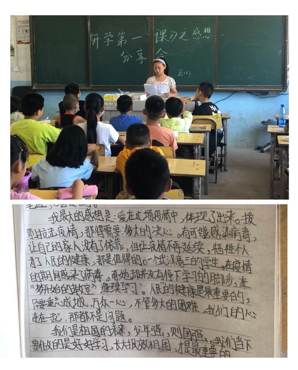 开学虽迟,但入学重要一课不能推。应教育部门的要求,上午9:50,全校18个班的学生已在各班主任的组织下,端端正正地坐在教室内观看《开学第一课》。观看期间,学生们都聚精会神,一些孩子被钟南山、张伯礼等疫情期间做出巨大贡献的英雄人物感动得潸然泪下。为树立学生正确的人生观及价值观,各班主任们在观看后便引导学生以多种方式分享观后感悟并交流自己的想法。